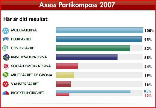 Jag genomförde just Axess aktuella partitest. Jag försöker se mig som oberoende tänkare (pretto, jag vet), men jag tycks nära sammanlänkad med i synnerhet ett parti. Mitt resultat (klicka för större storlek):