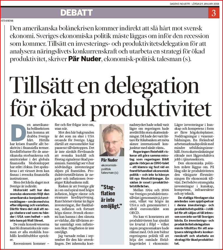 Pär Nuder hävdar i en debattartikel i DI (5/1) att produktiviteten i Sverige ”har sjunkit tre kvartal i följd”. Om så är fallet kan det ha samband med att sysselsättningen har ökat. Ny forskning av Ian Dew-Becker och Robert Gordon tyder nämligen på att det inom EU föreligger en negativ korrelation mellan produktivitets- och sysselsättningstillväxt – se deras uppsats ”The Role of Labour-Market Changes In the Slowdown of European Productivity Growth”. Rent intuitivt är detta inte särskilt svårt att förstå. När personer som tidigare inte var sysselsatta pga. låg produktivitet, vilket gjorde dem ointressanta för arbetsgivare, blir sysselsatta blir förstås den genomsnittliga arbetsproduktiviteten lägre.