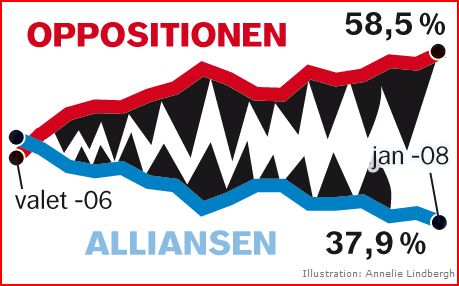 SvD rapporterar idag om det rekordstora gapet mellan regering och opposition i den senaste opinionsmätningen. Illustration från DN: