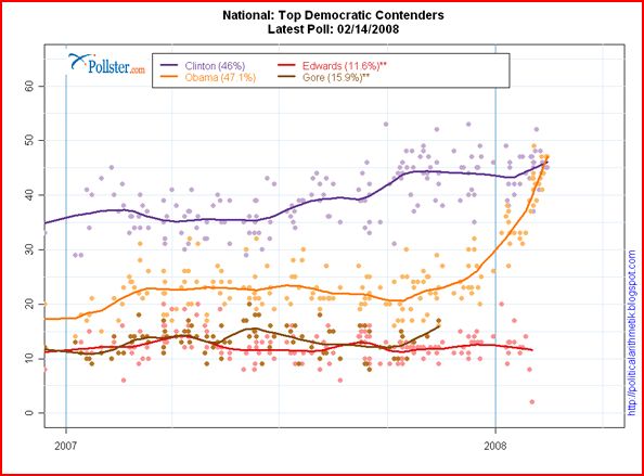 Opinionsmätningarna duggar tätt, såväl i Sverige som i USA. Jag gillar Pollsters ”megaopinionsundersökning”, som presenterar ett genomsnitt av ”alla” opinionsmätningar. Detta kunde vara en sak att redovisa också i Sverige, där den senaste tidens mätningar har gett motstridiga indikationer. Nå, Pollsters senaste sammanställning av mätningar om läget för demokraternas kandidater visar att Obama har gått om Clinton nationellt för första gången.