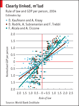 The Economist diskuterar förtjänstfullt denna forskning och visar ett diagram av Världsbankens Daniel Kaufmann, som på basis av tre studier påvisar ett positivt samband mellan rättsstatens kvalitet och välstånd: