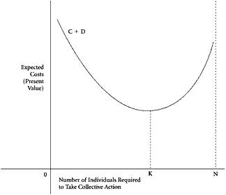De externa kostnaderna är lägre ju mer inklusiv beslutsregeln här — i hörnlösningen med krav på enhällighet är de noll, eftersom inget kollektivt beslut kan fattas som någon ogillar. Beslutskostnaderna är högre ju mer inklusiv beslutsregeln är — i hörnlösningen med krav på enhällighet är de extremt höga, eftersom alla måste vara överens och eftersom vissa alltid kan trilskas för att få förmånliga villkor. Lägger man ihop dessa båda kostnader får man kurvan i detta diagram: