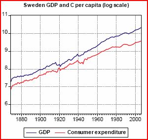 - Sveriges genomsnittliga tillväxttakt i real BNP per capita 1870—2006 har varit 2,3 procent. Det gör oss till det femte snabbast växande OECD-landet under denna period (Japan, Island, Finland och Norge växte snabbare). Genomsnittet för OECD-länder (21 stycken) är 2,05 procent, och för icke-OECD-länder (10 stycken) 1,99 procent.