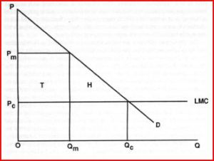 Any expenditure less than T will leave the monopolist better off than he would be if he were reformed into a competitive industry. And any expenditure in excess of H by the monopolist will render the value of the reform negative to the utilitarian reformer.