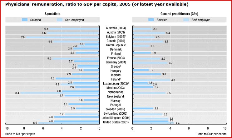 Läkare tjänar betydligt mer än den genomsnittliga inkomsttagaren i alla länder. I Sverige är t.ex. specialistläkares genomsnittslön i relation till BNP per capita 2,5. Detta kan låta mycket, men vid en internationell jämförelse framstår siffran som ganska låg — inom OECD varierar motsvarande siffra från 1,6 (Tjeckien) till 8,4 (Nederländerna):