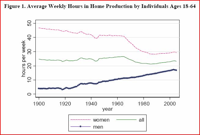 I en ny studie, accepterad för publicering i Journal of Economic History, visar Valerie Ramey att det antal timmar per vecka som ägnas åt hushållsarbete inte har minskat särskilt mycket i USA under 1900-talet. Däremot har en omfördelning av sådant arbete — med vilket avses matlagning, städning, omhändertagande av familjemedlemmar, handlande och skötsel av hushållet i övrigt — ägt rum, från kvinnor till män: