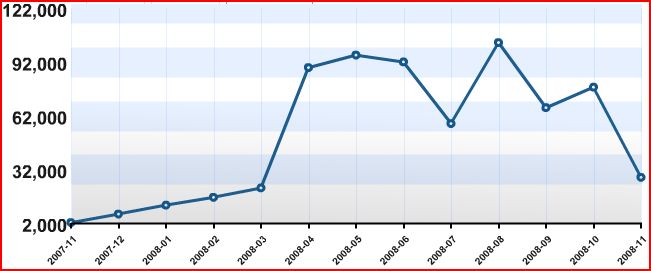 Idag är det exakt ett år sedan denna blogg startades. Den 15 november 2007 fick jag för mig att börja dela med mig av mina tankar till en bredare publik än den fysiska vänkretsen. Sedan dess har jag haft 671 700 besök, dvs. i genomsnitt 1 840 besök per dag. Per månad ser besöken ut så här: