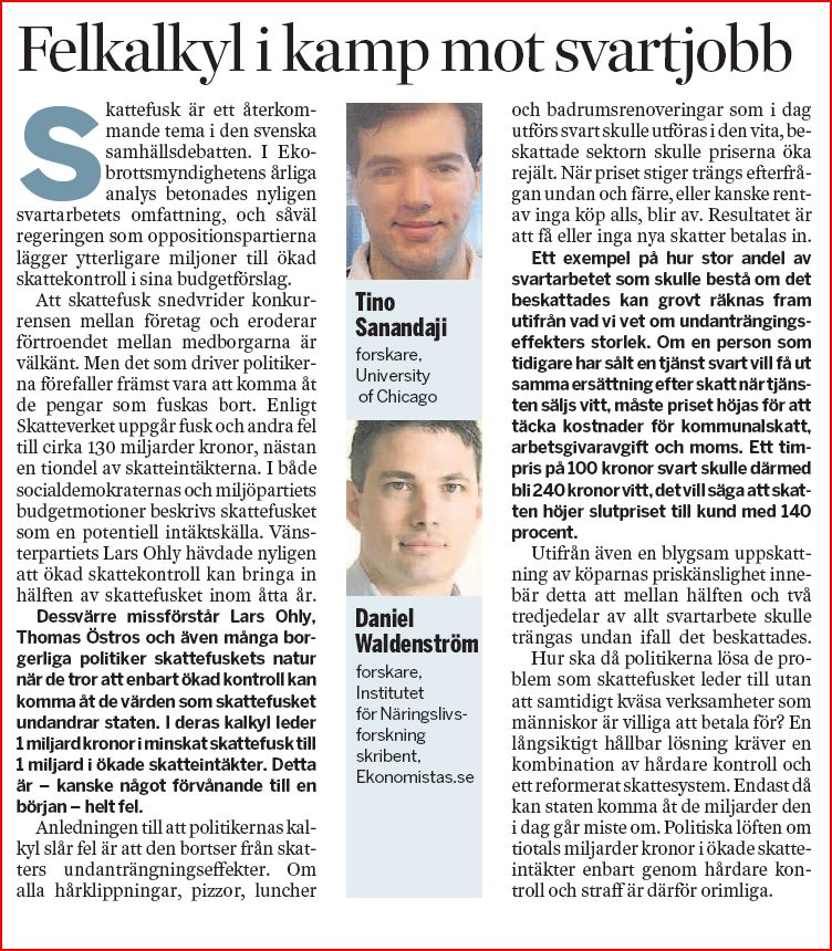 Dessvärre missförstår Lars Ohly, Thomas Östros och även många borgerliga politiker skattefuskets natur när de tror att enbart ökad kontroll kan komma åt de värden som skattefusket undandrar staten. I deras kalkyl leder 1 miljard kronor i minskat skattefusk till 1 miljard i ökade skatteintäkter. Detta är – kanske något förvånande till en början – helt fel. Anledningen till att politikernas kalkyl slår fel är att den bortser från skatters undanträngningseffekter. Om alla hårklippningar, pizzor, luncher och badrumsrenoveringar som i dag utförs svart skulle utföras i den vita, beskattade sektorn skulle priserna öka rejält. När priset stiger trängs efterfrågan undan och färre, eller kanske rentav inga köp alls, blir av. Resultatet är att få eller inga nya skatter betalas in.