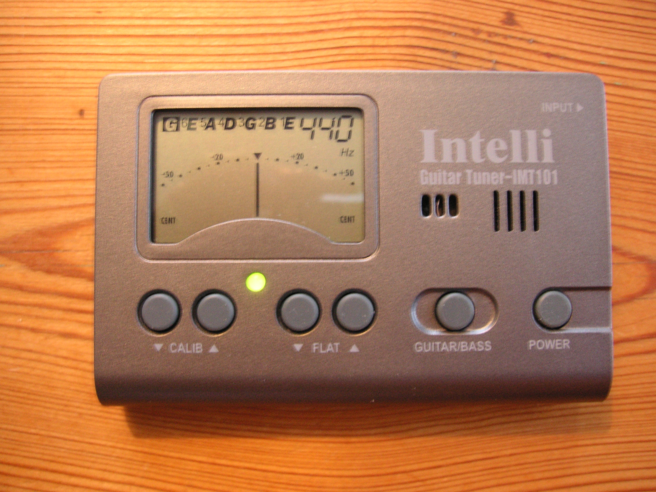 Jag fick nyligen låna en liten mannick som gör alltihop mycket lättare. Det är en liten gitarrstämmare (se bild). Med den kan vem som helst stämma en gitarr. Man knäpper på en sträng och skruvar lite på en av skruvarna. När strängen är rätt stämd så lyser en liten lampa grönt och nålen står i mitten av skalan. Det är lätt som en plätt.