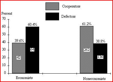 Och se hur studenter med nationalekonomisk inriktning är mindre benägna att samarbeta i fångarnas dilemma (enligt ett experiment):