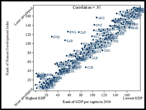 En vanlig kritik mot nationalekonomer är att de i alltför hög grad betonar materiallt välstånd som viktigt. Mänskligt välbefinnande är så mycket mer, menar kritikerna. Så kan det förstås vara. Men ta en titt på följande diagram av Justin Wolfers, som visar sambandet mellan länders rangordning i termer av BNP per capita och deras rangordning enligt FN:s Human Development Index (HDI):
