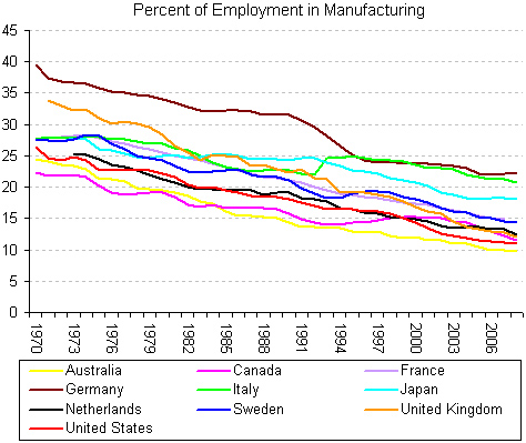 Ekonomier genomgår strukturella förändringar. För ett par hundra år sedan svarade jordbruket för en mycket stor del av såväl BNP som sysselsättning. Sedan tog industrin över, men den är sedan flera decennier också på nedgång: