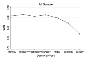 Intervjuar man människor om deras upplevda lycka på vardagar överskattar man alltså sannolikt deras ”genomsnittliga” lyckonivå. Dessutom varierar variationen grupper emellan — t.ex. verkar singlar mer stabilt lyckliga över veckans dagar än gifta — vilka kan orsaka bias när lyckonivån grupper emellan jämförs. En illustration av hur lyckan, mätt från 0 till 10, varierar per veckodag:
