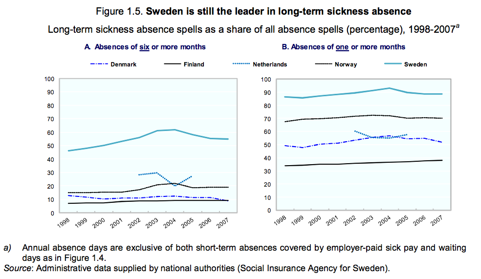 OECD kom förra året med rapporten Sickness, Disability, and Work: Breaking the Barriers, i vilken regeringens reformer på sjukförsäkringsområdet granskades. Som bakgrund kan t.ex. denna figur över långstidssjukskrivningen i Sverige och i jämförbara länder studeras: