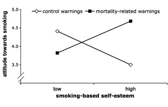 One of the principal vehicles for informing tobacco consumers about the risks of smoking is the warning message on each cigarette package. Based on terror management theory, the present study investigates the impact of mortality-salient warnings on cigarette packages compared to warnings with no mortality threat. Results suggest that to the degree that smoking is a source of self-esteem, later attitudes towards smoking become more positive if the warning message is mortality-salient. On the contrary, if the warning is terrifying but not mortality-salient and relates to the source of self-esteem, smoking attitudes become more negative with higher smoking-based self-esteem. Thus, mortality-salient warnings may increase the tendency to favor smoking under certain circumstances.