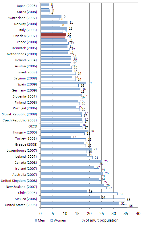 En färsk sammanställning från OECD visar att Sverige har relativt få feta invånare, där fetma definieras som ett BMI på 30 kg/m² och däröver: