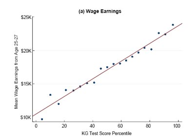 Jag fastnade för detta diagram över sambandet mellan provresultat i förskoleåldern och lön i 25-27-årsåldern från den nya studien ”How Does Your Kindergarten Classroom Affect Your Earnings?”, återgivet av William Easterly:
