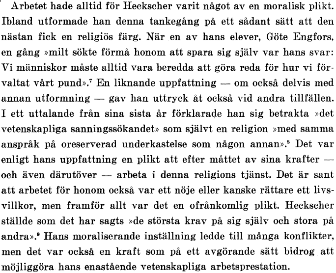 Jag ser absolut inte arbetet som en plikt, snarare som ett nödvändigt ont som jag, förvisso, försöker utföra som om jag vore plikttrogen. Om människor vore genuint plikttrogna, som Heckscher, skulle socialförsäkringssystemens utformning, med avseende på risk för överutnyttjande och fusk, antagligen vara ett icke-problem.
