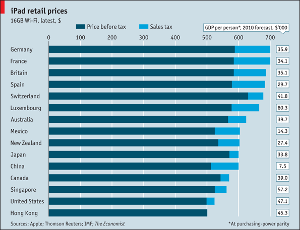 Vilken dag som helst väntas iPad lanseras i Sverige. Priserna på de sex olika modellerna vet vi för närvarande inget om. Denna figur från The Economist visar hur priset på den billigaste modellen varierar mellan olika länder: