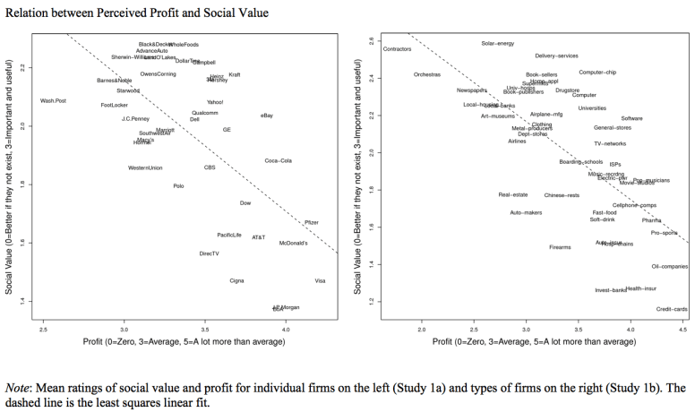 Two studies find a strong negative correlation between profit and perceived social value across both real firms and entire industries. This relationship holds for both perceived profit and actual profit information obtained from public data. A third study shows that manipulating the mere presence of a profit motive changes the perceived value of hypothetical organizations and their practices. Even in one of the most market-oriented cultures in the world, people doubt the ability of profit-seeking business to benefit society.