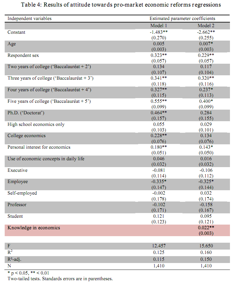 The key finding is that the economic knowledge variable is positively related and contributes to explain 3.5% of the variance of the pro-reform indicator. Since people with little knowledge in economics are more reluctant to economic change, then the ability of the French government to adopt more far-fetching economic reforms would increase if economics education improves.