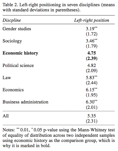 Man kan dela in ämnena i tre grupper: högerämnen (företagsekonomi, nationalekonomi, juridik), mittämnen med viss vänsterinriktning (ekonomisk historia och statsvetenskap) och vänsterämnen (genusvetenskap och sociologi). Det finns tre gånger så många företagsekonomer med sympatier för Alliansen som för de rödgröna, medan det finns fem gånger så många sociologer som stödjer de rödgröna jämfört med Alliansen. Folkpartiet är större än Moderaterna i alla ämnen. Socialdemokraterna är bara största parti för statsvetarna. Störst parti bland sociologer är Vänsterpartiet. (För mer detaljer om partifördelning, se Table C1 i Online Supplement.)